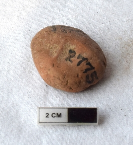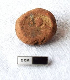 | Description / विवरण | It is an almost circular terracotta sealing of baked clay, there is a faded impression of two deer and a wheel in-between. |