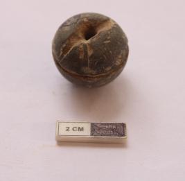 | Description / विवरण | An arecanut shape bead. It is gray in color and partially damaged. |