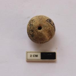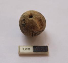 | Description / विवरण | A terracotta bead in spherical shape. It is gray in color and partially damaged in condition. |