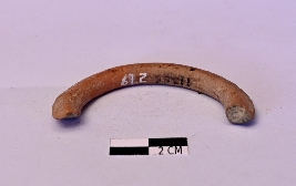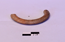 | Description / विवरण | Broken half of a terracotta bangle , having a circular section. Its surface is treated with red slip and is in abraded and faded condition. |