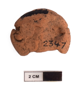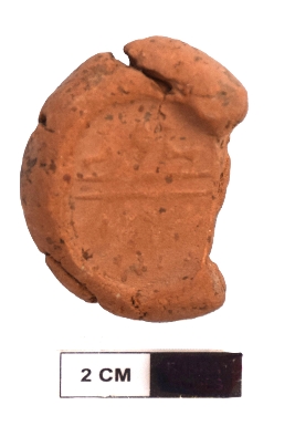 | Description / विवरण | It is a broken terracotta sealing of baked clay, the upper half, which is separated from the lower by double horizontal line, depicting two deer and a wheel in-between. |