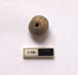 | Description / विवरण | A terracotta bead in a globular shape. It is gray in color and partially damaged. |