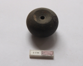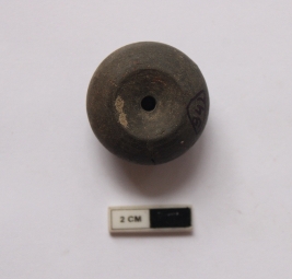 | Description / विवरण | A terracotta bead in a arecanut shape. It is gray in color and partially damaged. |