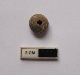 | Description / विवरण | A terracotta bead in a circular shape. It is dull gray and red in color. |