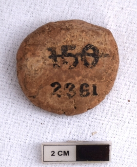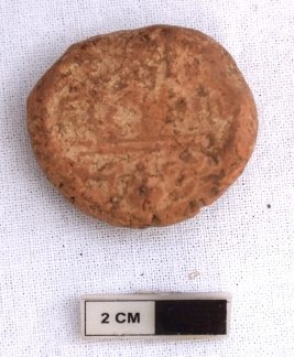 | Description / विवरण | It is an almost circular terracotta sealing of baked clay, the upper half, which is separated from the lower by double horizontal line, depicting two deer and a wheel in-between. |