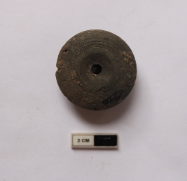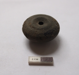 | Description / विवरण | A terracotta bead in a arecanut shape. It is gray in color and partially damaged. |
