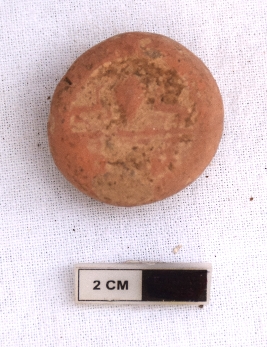 | Description / विवरण | It is a circular terracotta sealing of baked clay, the upper half, which is separated from the lower by double horizontal line, depicting two deer and a wheel in-between. |