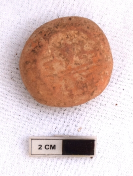 | Description / विवरण | It is an almost circular terracotta sealing of baked clay, the upper half, which is separated from the lower by double horizontal line, depicting two deer and a wheel in-between. |