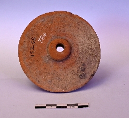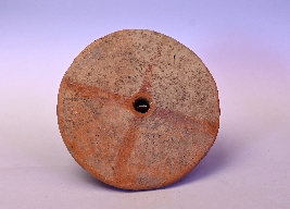 | Description / विवरण | A moulded terracotta wheel with a prominent hub, painted in red over buff slip with two intersecting lines on the exterior in red paint. |
