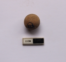| Description / विवरण | A sling ball in a spherical shape. It is dull red in color. |