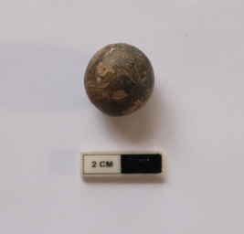 | Description / विवरण | A sling ball in a spherical shape. It is dull red in color and partially damaged. |