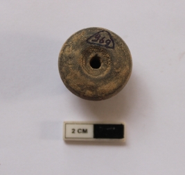 | Description / विवरण | A terracotta bead in a arecanut shape. It is gray in color. |