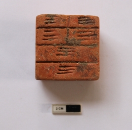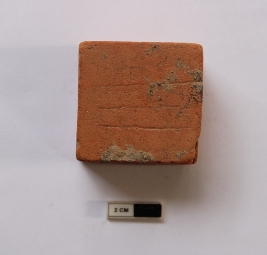 | Description / विवरण | A terracotta weight in a square shape. It is dull red in color and partially broken in condition. Incised lines are visible on the surface. |