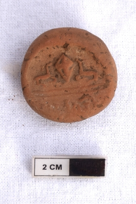 | Description / विवरण | It is a terracotta sealing of baked clay, the legend has worn out. The impression of two deer and a wheel in-between is observed. |