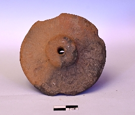 | Description / विवरण | A well baked terracotta wheel with a prominent hub and a concave interior. The dull red color object has been moulded and is partly broken around the periphery. |