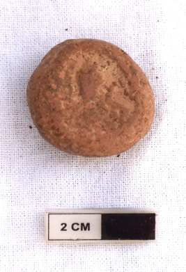 | Description / विवरण | It is a terracotta sealing of baked clay, depicting two deer and a wheel in-between, the legend is weathered and not readable. |