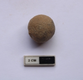 | Description / विवरण | A terracotta sling ball in a spherical shape. |