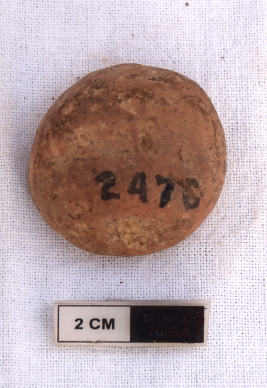 | Description / विवरण | It is an almost circular terracotta sealing of baked clay, the impression is not clear due to weathering, the upper half, which is separated from the lower by double horizontal line, depicting two deer and a wheel in-between. |