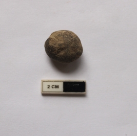 | Description / विवरण | A terracotta sling ball in a spherical shape. It is dull red in color. |