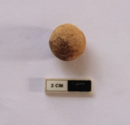 | Description / विवरण | A terracotta sling ball in a spherical shape. It is dull red in color and damaged in condition. |