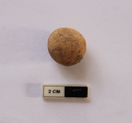 | Description / विवरण | A terracotta sling ball in a spherical shape. It is dull red in color. |