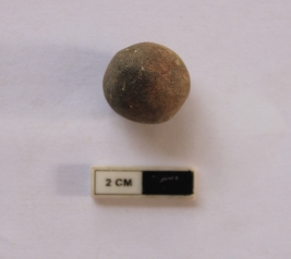 | Description / विवरण | A terracotta sling ball in a spherical shape. It is dull red in color and damaged in condition. |