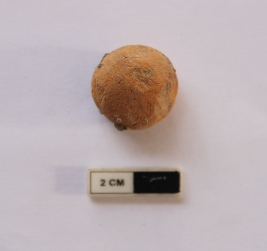 | Description / विवरण | A terracotta sling ball in a spherical shape. It is dull red in color. |