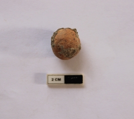 | Description / विवरण | A terracotta sling ball in a spherical shape and dull red in color. It is damaged in condition. |