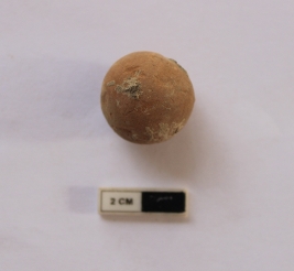 | Description / विवरण | A terracotta sling ball in a spherical shape and it is red in color. It is damaged in condition. |
