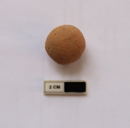 | Description / विवरण | A terracotta sling ball in a spherical shape. It is dull red in color. |