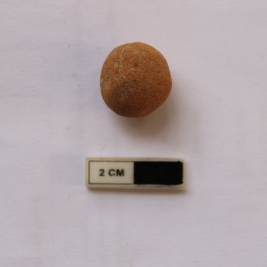 | Description / विवरण | A terracotta sling ball in a spherical shape. It is dull red in color. |