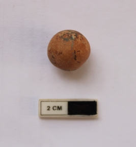 | Description / विवरण | A terracotta sling ball in a spherical shape. It is dull red in color. |