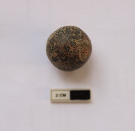 | Description / विवरण | A terracotta sling ball in a spherical shape. It is dull red and black in color. |
