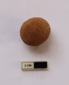 | Description / विवरण | A terracotta sling ball in a spherical shape. It is dull red in color. |
