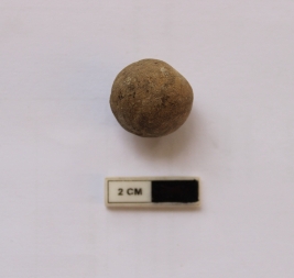 | Description / विवरण | A terracotta sling ball in a spherical shape. It is dull gray in color. |