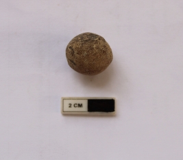 | Description / विवरण | A terracotta sling ball in a spherical shape. It is dull gray in color. |
