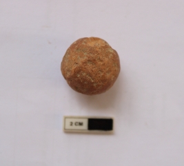| Description / विवरण | A terracotta sling ball in a spherical shape. It is dull red in color. |