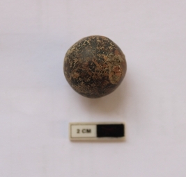| Description / विवरण | A terracotta sling ball which is spherical in shape. It is dull red in color and damaged in condition. |