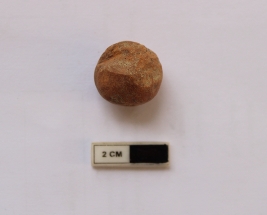 | Description / विवरण | A terracotta sling ball which is spherical in shape. It is bright red in color and damaged in condition. |