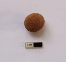 | Description / विवरण | A terracotta sling ball in a spherical shape. It is dull red in color. |