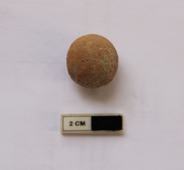 | Description / विवरण | A terracotta sling ball in a spherical shape. It is dull red in color. |