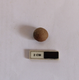 | Description / विवरण | A terracotta sling ball which is spherical in shape. It is dull red in color and damaged in condition. |