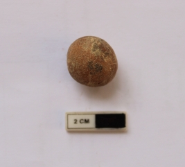 | Description / विवरण | A terracotta sling ball which is spherical in shape. It is dull red in color and damaged in condition. |