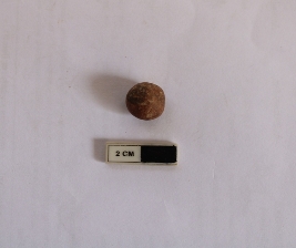 | Description / विवरण | A terracotta sling ball which is spherical in shape. It is dull red in color and damaged in condition. |