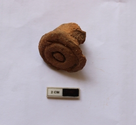 | Description / विवरण | A terracotta stamp ( ) which is damaged in condition and red in color, with spiral ornamentation at its bottom. |