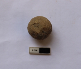 | Description / विवरण | A terracotta sling ball which is spherical in shape. It is dull red in color and damaged in condition. |