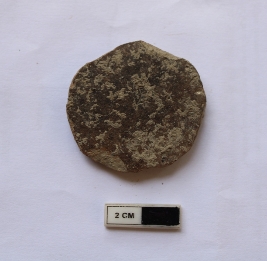 | Description / विवरण | A terracotta hopscotch in a circular shape. It is greyish-red in color and damaged in condition. |