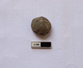 | Description / विवरण | A terracotta sling ball ( ) which is spherical in shape. It is grey in color and damaged in condition. |