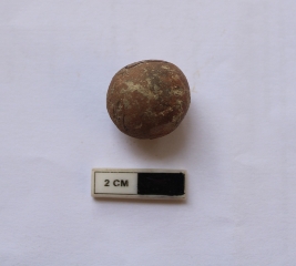 | Description / विवरण | A terracotta sling ball which is spherical in shape. It is dull red in color and damaged in condition. |