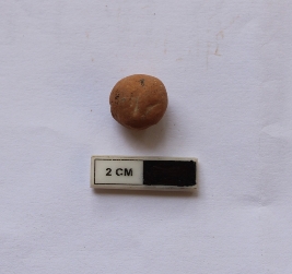 | Description / विवरण | A terracotta sling ball which is spherical in shape. It is dull red in color and damaged in condition. |